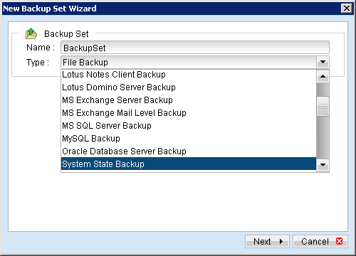 - Create a System State Backup set by selecting [System State Backup] from the backup set type dropdown menu.